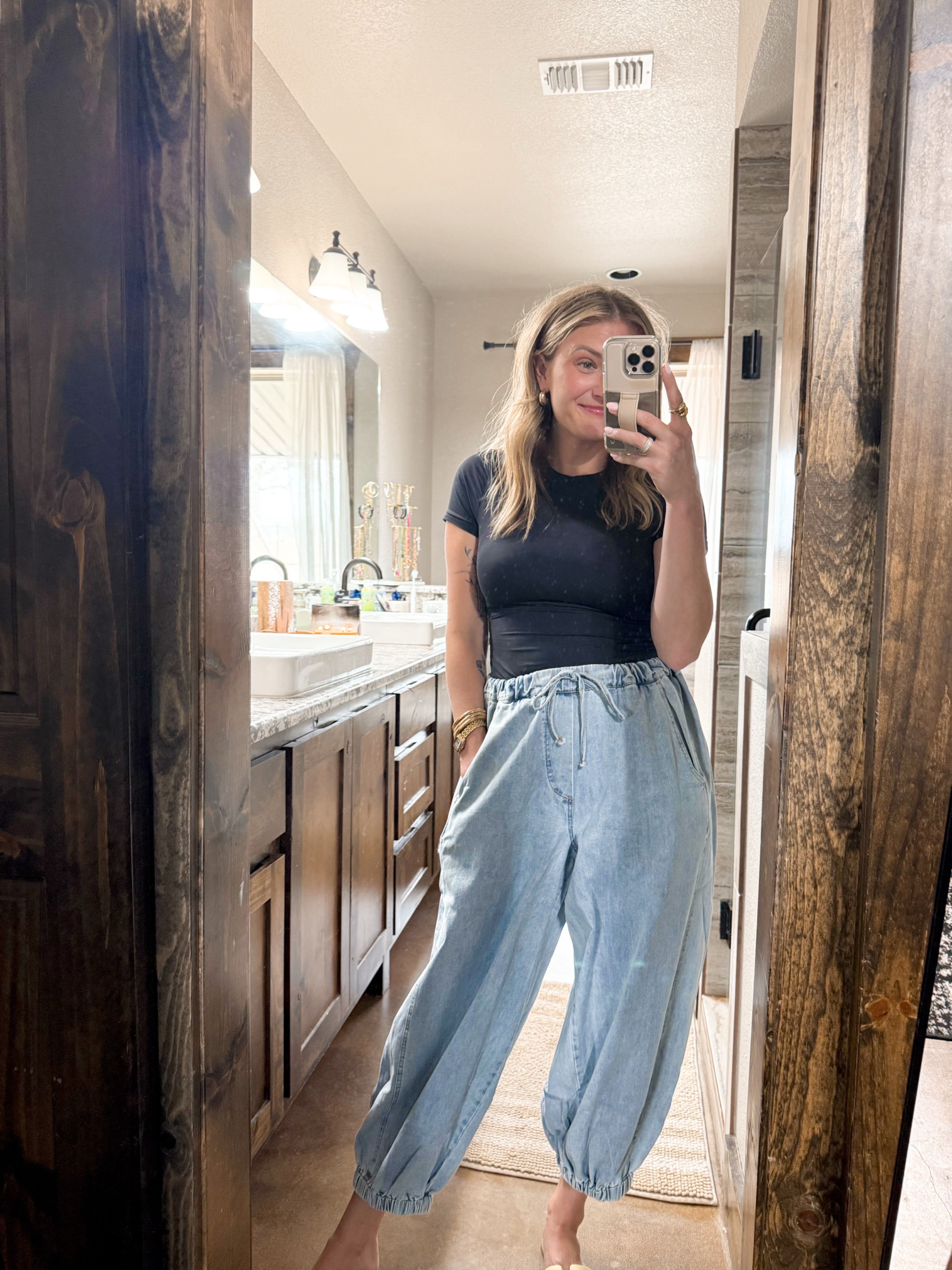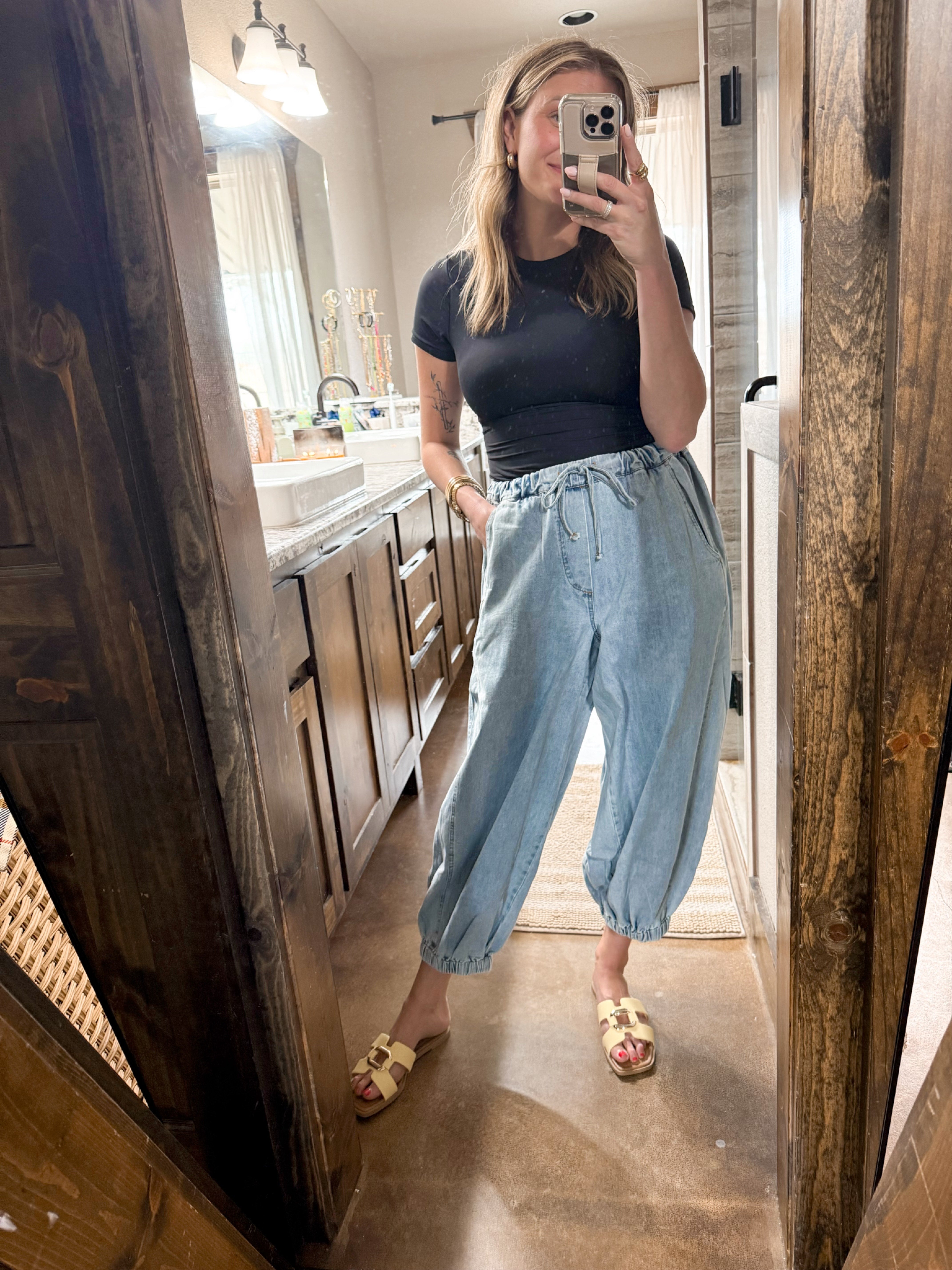 - These Denim Drawstring Pants are the ultimate choice for casual comfort and style. With a loose fit for maximum mobility and a functional drawstring waistband and pockets, these pants provide endless outfit possibilities. Perfect for those looking for a laid-back yet stylish denim option.