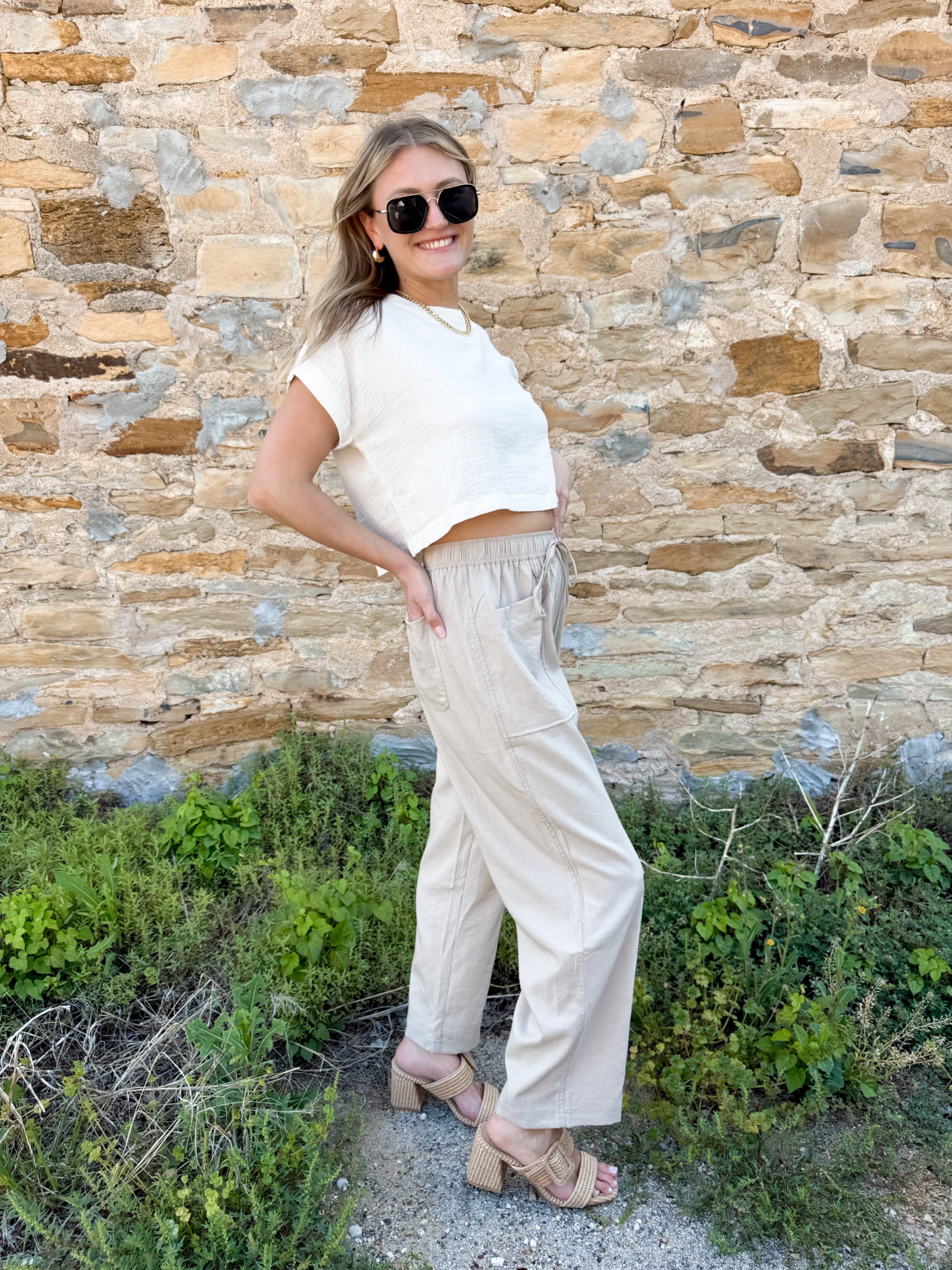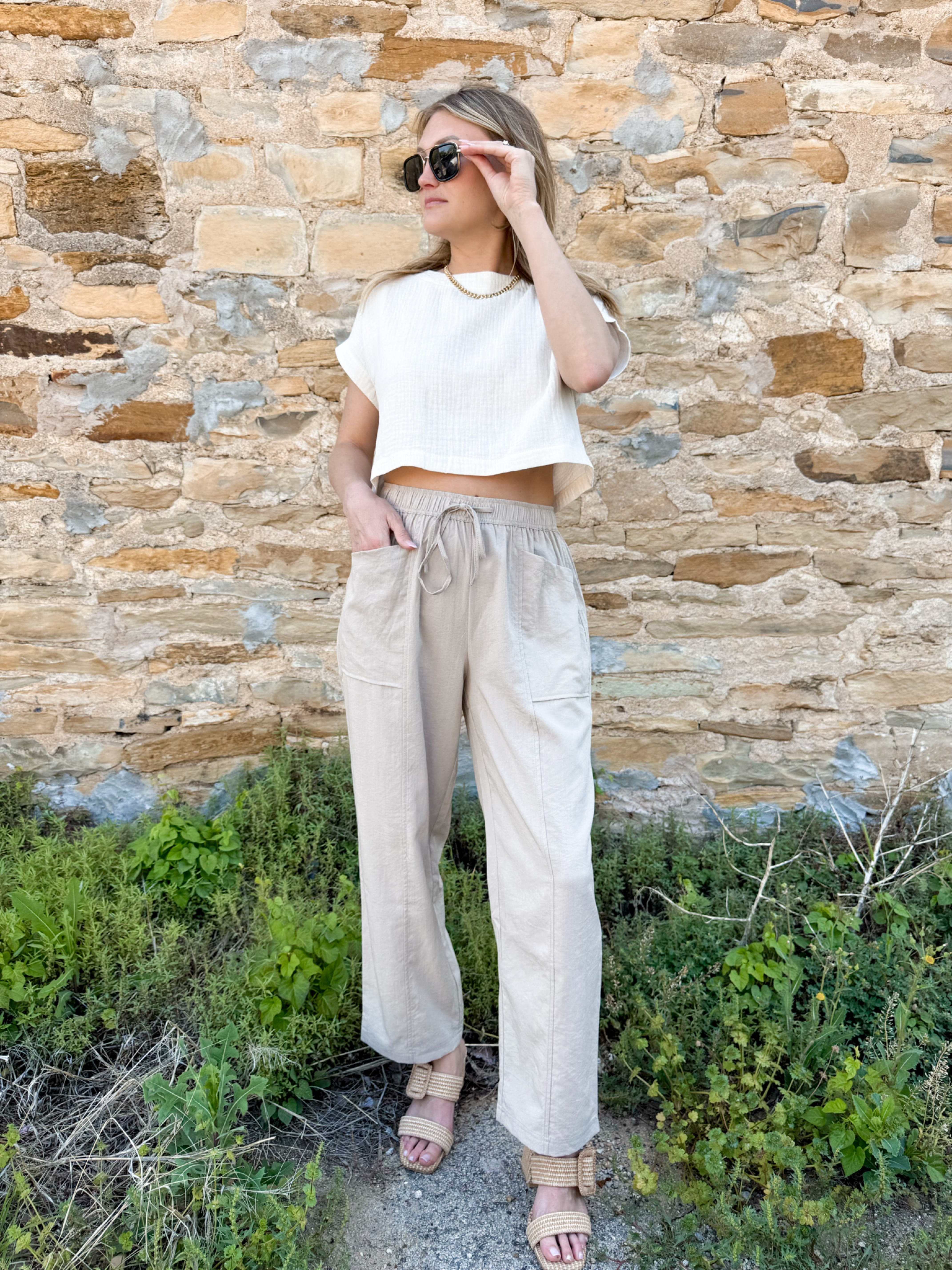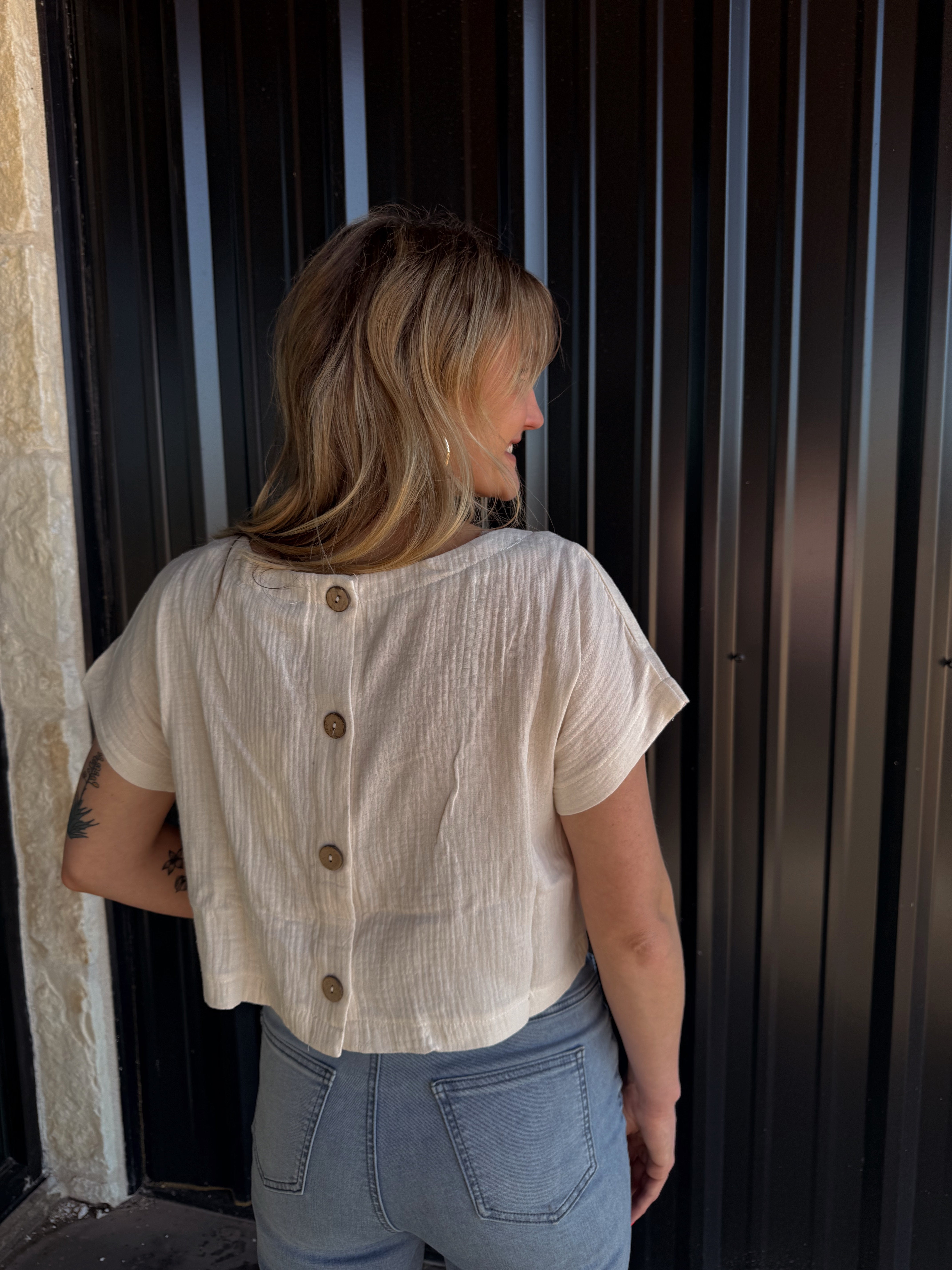- Expertly woven from high-quality cotton gauze, the August Top-Cream is a versatile addition to any wardrobe. With a round neck, short sleeves, and back button down closure, this crop top offers both comfort and style. Perfect for any occasion, it's a must-have for fashion-forward individuals.