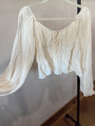 - This Boho Breeze Shirt features a woven cotton fabric that ensures breathability and comfort. Its scoop neck and long cap sleeves offer a flattering silhouette, while the smocked bodice provides a flexible fit. The front tie strap detail adds a stylish touch, making it a versatile piece for both casual and dressier occasions. Ideal for those seeking effortless bohemian elegance with practical comfort.