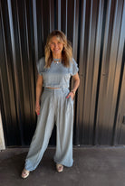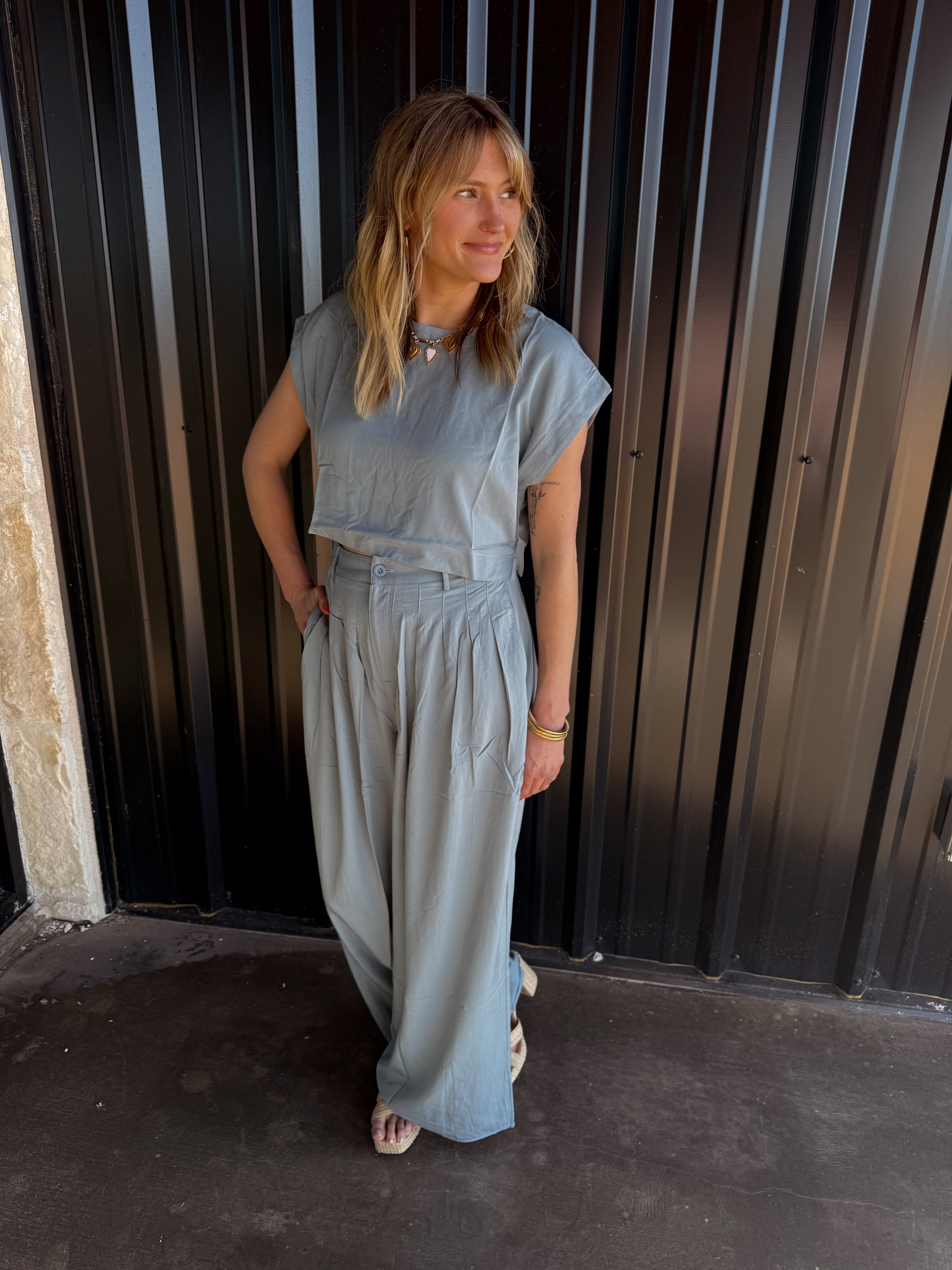 - This fashionable crop top and pleated pant set in blue is perfect for any occasion. The crop top adds a trendy touch while the pleated pants provide comfortable and stylish coverage. Made with high quality fabric, this set offers both versatility and durability. Elevate your wardrobe with this must-have set.