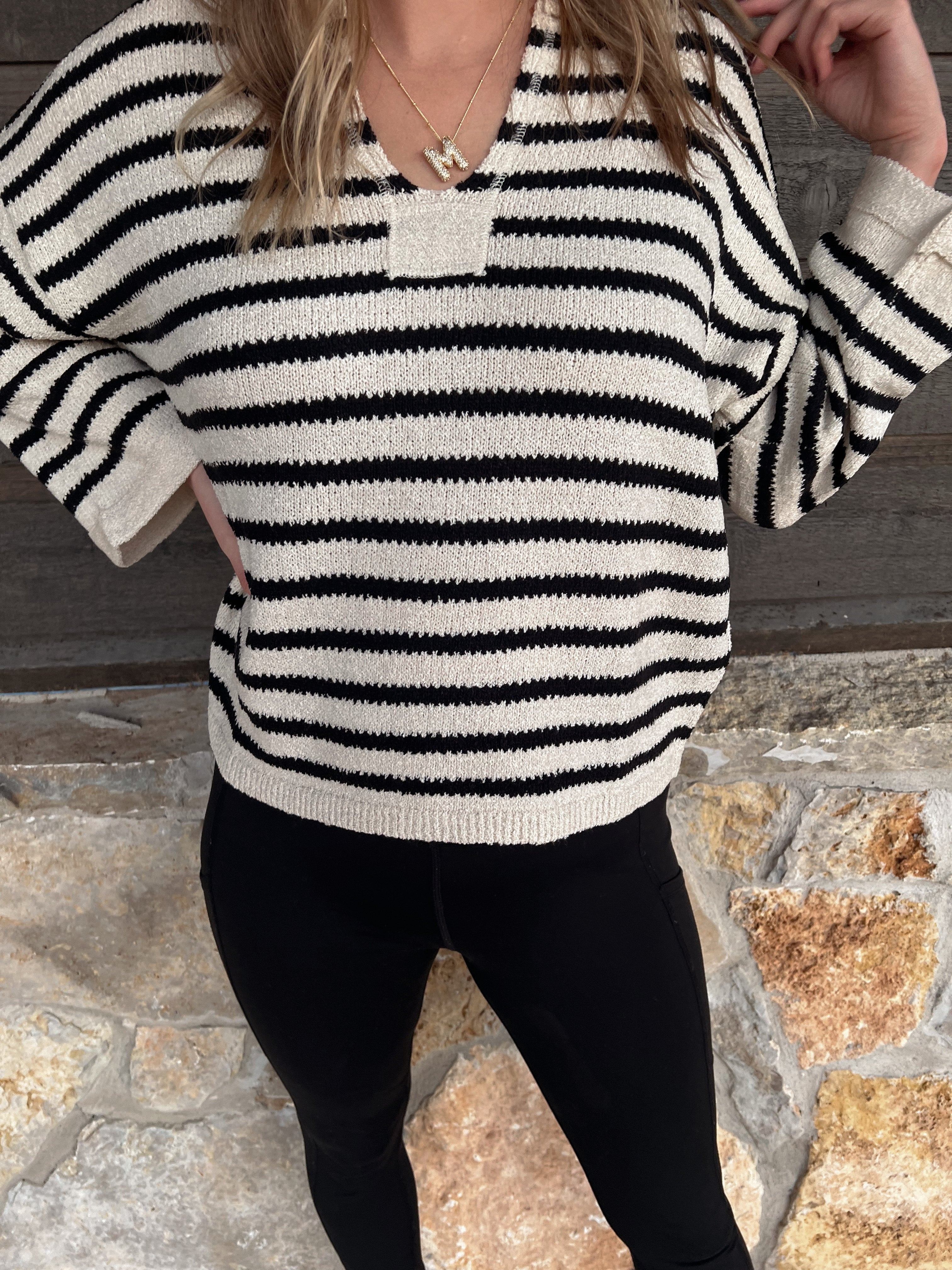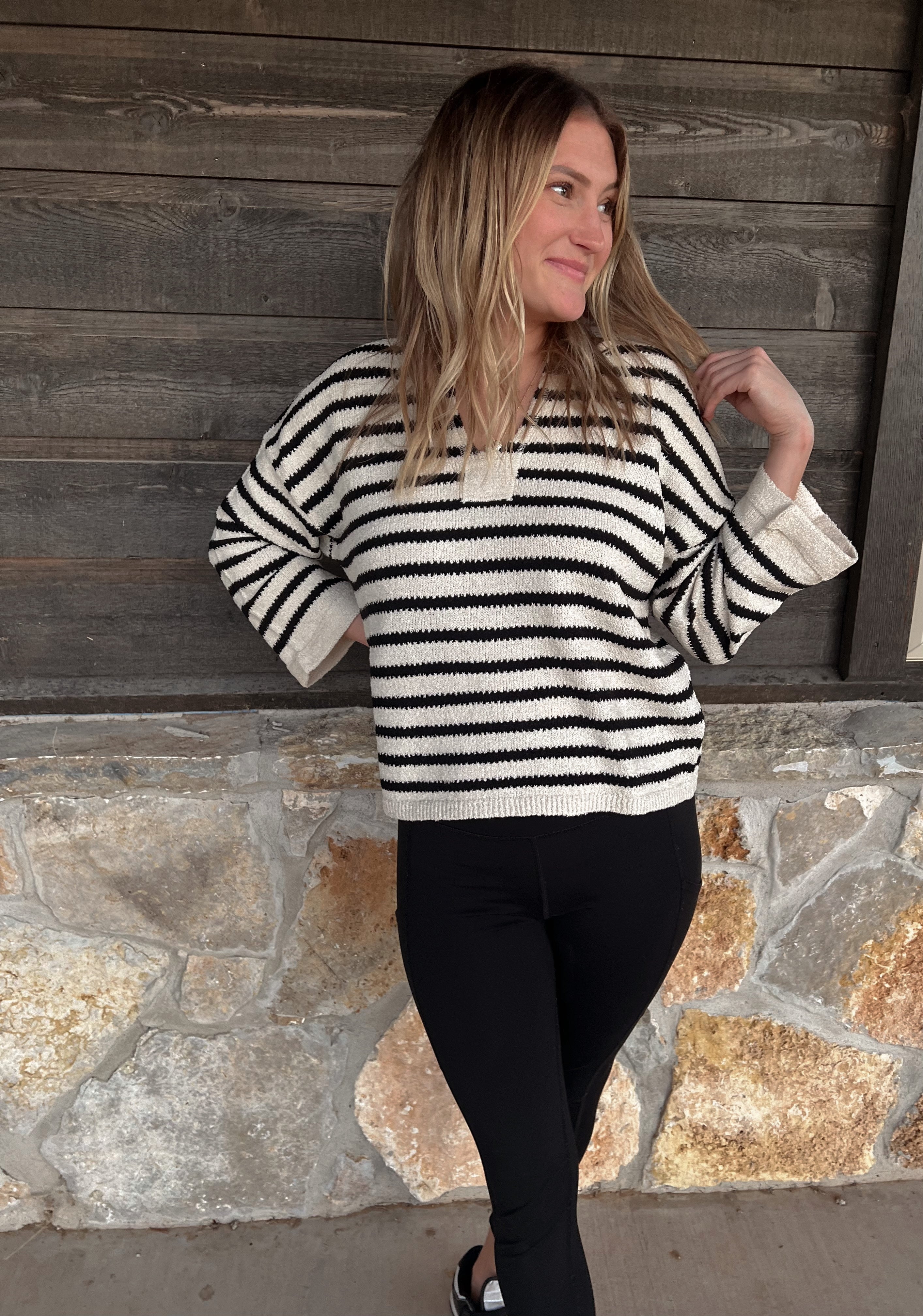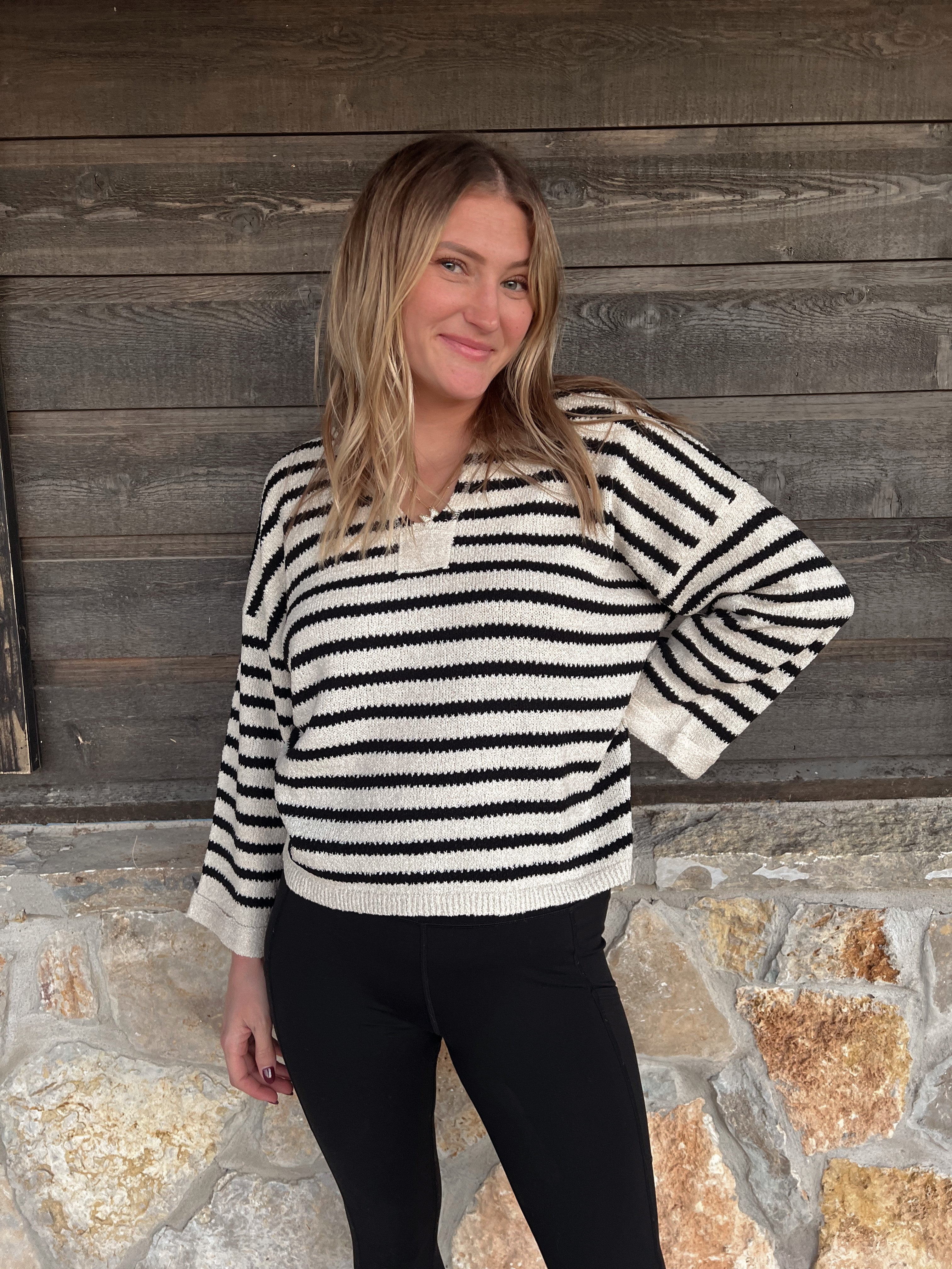 - Expertly crafted with a soft, sweater knit fabric, this cream-colored Stripe Split Neck Sweater features a stylish split neckline, dropped shoulders, and exposed stitching. Its rough edge and pullover design add a touch of laid-back charm. Made with 75% acrylic and 25% polyester, this sweater is both cozy and chic.