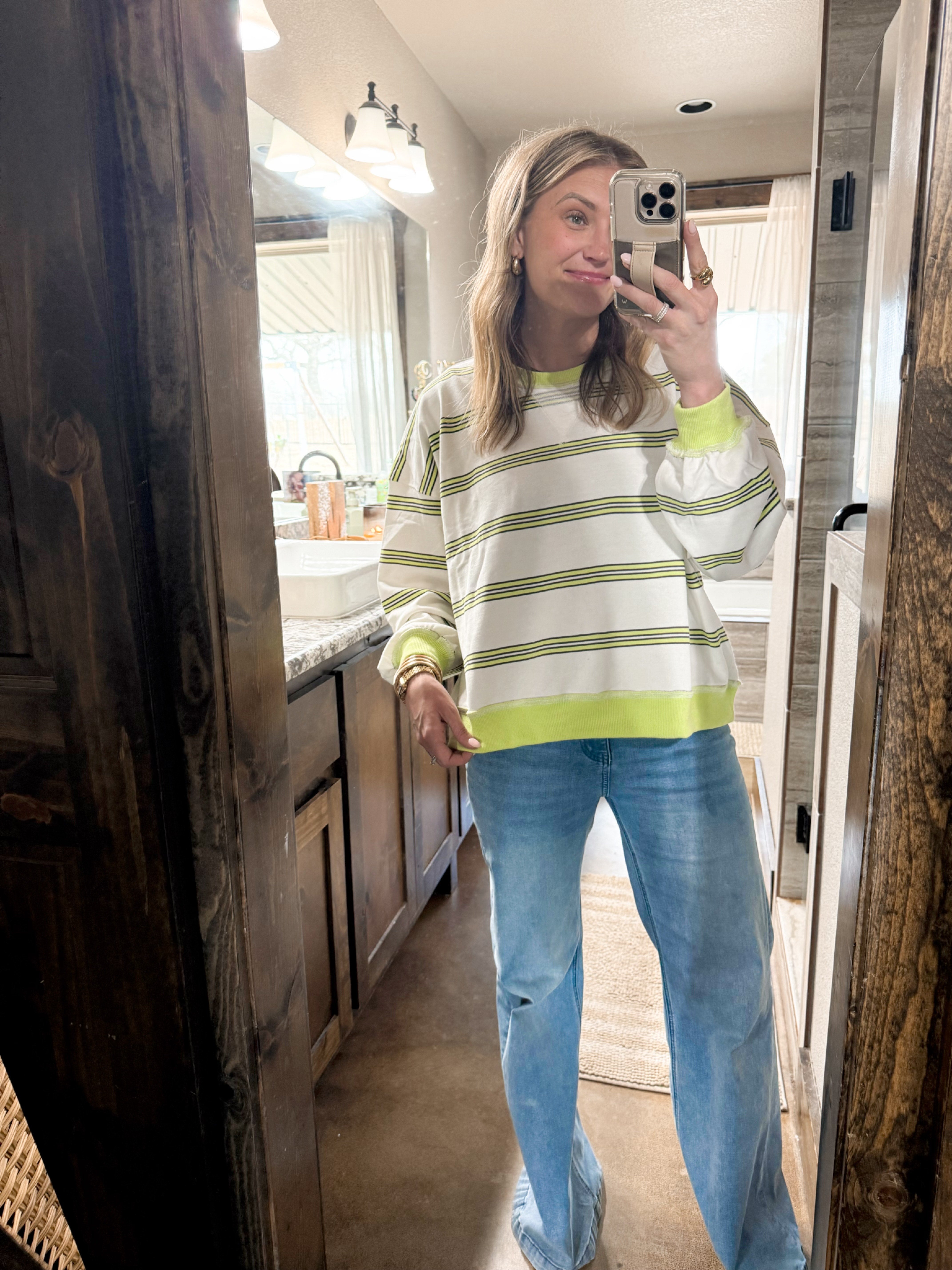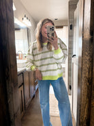 - Elevate your wardrobe with our Striped Color Block Sweater. Made from soft French Terry fabric, this sweater features traditional rib knit on the neck, sleeve and bottom hem. The bold contrast thread adds a contemporary touch to the timeless striped design. Stay warm and stylish with this must-have piece.